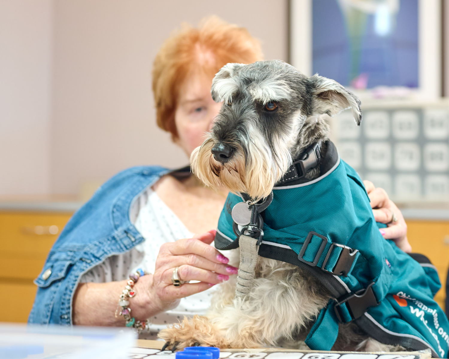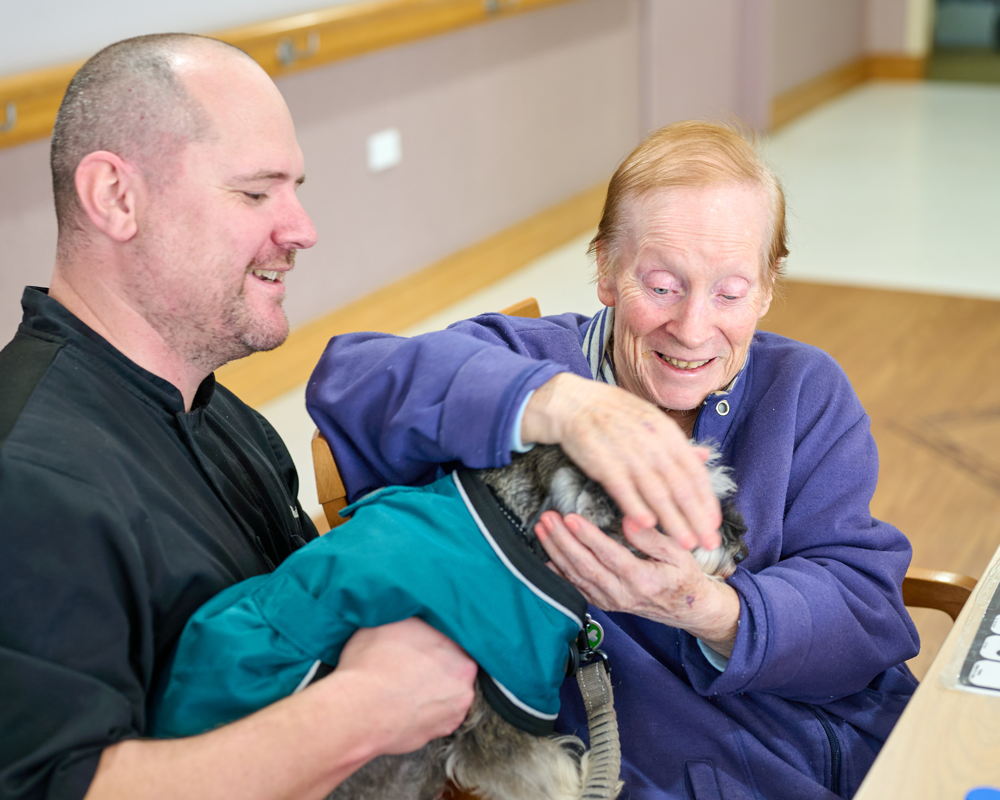 Timid at first but playful once he warms up, Roy is known for his signature handshakes, nose kisses, and love of sausages. More than just a companion, he’s a calming presence, a conversation starter, and, for many residents, the highlight of their day.